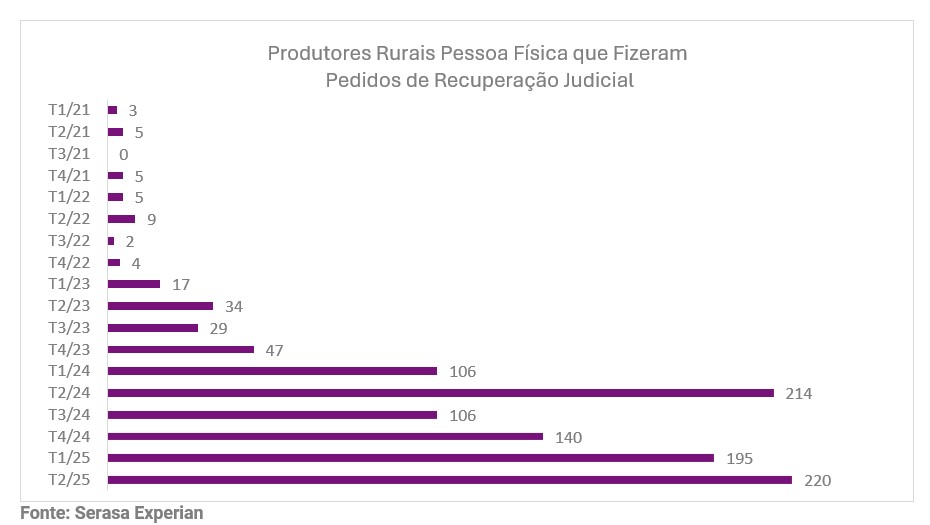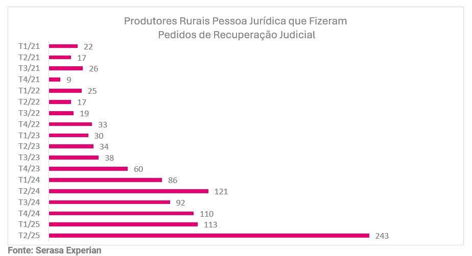 Os produtores rurais que trabalham com perfil de pessoa jurídica foram os que mais optaram pela recuperação judicial no segundo trimestre de 2025, marcando 243 requisições. Em comparação trimestral com 2024 houve alta, já que o período registrava 121 pedidos. Confira no gráfico a seguir: