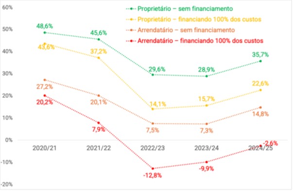 Para o arrendatário, a situação foi mais crítica: de 27,2% em 2020/21 para apenas 7,3% em 2023/24, com recuperação parcial para 14,8% em 2024/25. Cenários com financiamento total dos custos no mercado de crédito ampliam ainda mais essa pressão, reduzindo as margens a níveis mínimos.