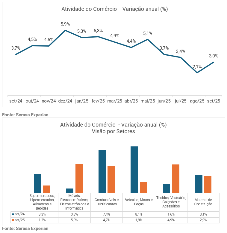 Após período de desaceleração, atividade do comércio avançou em setembro, puxada por Motos Veículos e Peças, indica Serasa Experian