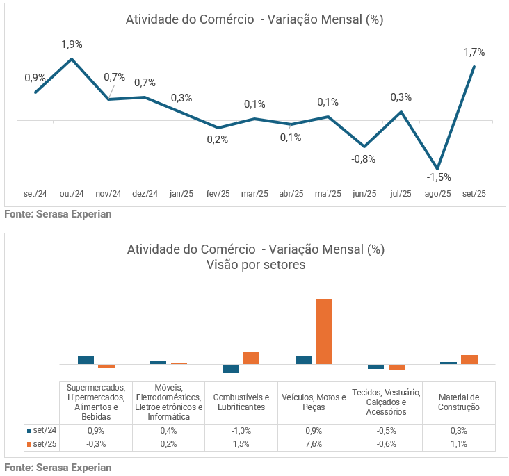 Na comparação com agosto de 2025, o mês de setembro registrou um crescimento de 1,7% na atividade do comércio físico brasileiro. Os dados são do Indicador de Atividade do Comércio da Serasa Experian, primeira e maior datatech do país, que analisa o movimento do segmento pelo volume de consultas ao crédito. O setor que mais contribuiu para o resultado foi o de “Veículos, Motos e Peças” (7,6%). Veja, nos gráficos a seguir, a variação mensal e a comparação dos setores: