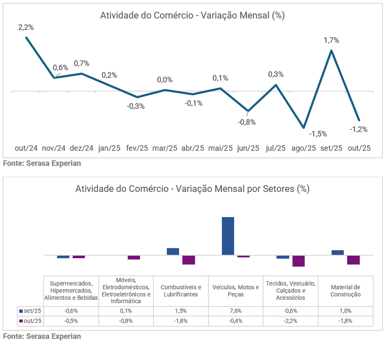 Segundo a economista da datatech, Camila Abdelmalack, o resultado reflete a combinação de fatores macroeconômicos que continuam limitando o consumo. “Mesmo após datas de incentivo ao consumo, como Dia das Crianças, a atividade perdeu força. A inflação ainda pressionada em itens de serviços, a manutenção dos juros elevados e o crédito caro seguem restringindo as compras parceladas e o consumo de bens duráveis, enquanto as famílias permanecem cautelosas diante de um orçamento mais comprometido”, explica.