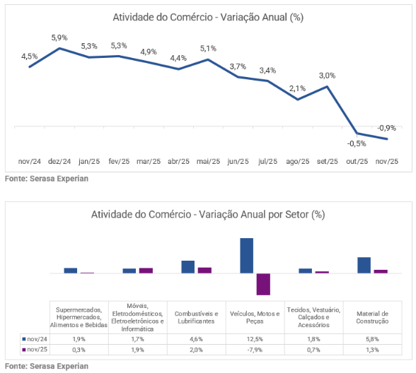 A economista da Serasa Experian, Camila Abdelmalack, avalia que o crescimento de novembro reflete um cenário de consumo ainda cauteloso, mas com estímulos pontuais trazidos pela sazonalidade do período. “A Black Friday contribuiu para sustentar a atividade do comércio em novembro, especialmente em segmentos menos dependentes de financiamento, ao antecipar compras e estimular decisões de consumo por meio de descontos. Ainda assim, o ambiente de juros elevados e crédito caro segue limitando a recuperação de setores mais sensíveis, como o de veículos, mantendo o avanço do indicador em um ritmo moderado”, explica.