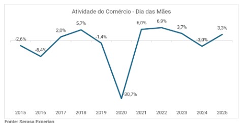 O Indicador de Atividade do Comércio da Serasa Experian, primeira e maior datatech do Brasil, revelou que, na semana comemorativa do Dia das Mães (05 a 11 de maio deste ano comparada a 06 a 12 de maio de 2024), a atividade do varejo físico cresceu de 3,3%. A economista da Serasa Experian, Camila Abdelmalack, avalia que, "esta é a segunda data mais importante para o comércio varejista, e mesmo diante de juros altos e inflação persistente, o setor conseguiu aproveitar a ocasião. A busca por presentes mais acessíveis e a preferência por compras em lojas físicas demonstram que o consumidor está mais cauteloso, mas ainda valoriza momentos de celebração. O varejo que soube adaptar sua oferta, apostar em multicanais e facilitar o pagamento colheu os melhores resultados”. Confira os dados dos últimos 10 anos: