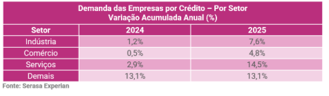 Na comparação por setor, a categoria “Demais”, que engloba “Primário”, “Financeiro” e “Terceiro Setor”, foi a que apresentou o maior crescimento na busca por crédito ao longo de 2025, com alta de 13,1% no acumulado anual. Na outra ponta, o segmento do “Comércio” registrou a menor variação no ano, com avanço de 4,8%. Veja os dados na tabela a seguir: