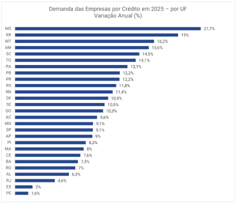 Na análise por região, a maior parte dos estados apresentou crescimento na demanda por crédito no acumulado de 2025. Os maiores avanços foram observados em Mato Grosso do Sul (21,7%), Roraima (19%), Mato Grosso (16,2%), Amazonas (15,6%) e Santa Catarina (14,5%). Na outra ponta, as menores variações foram registradas em Rondônia (7%), Alagoas (6,3%), Rio de Janeiro (4,6%), Espírito Santo (2%) e Pernambuco (1,6%). Veja, a seguir, o detalhamento por UFs.