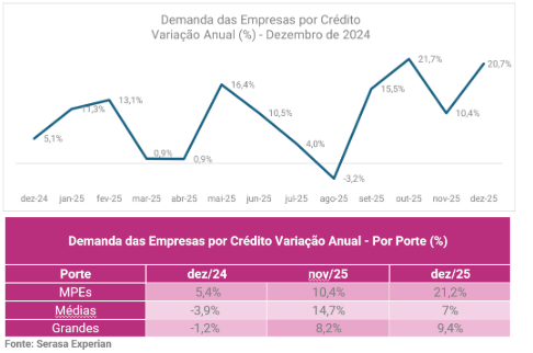 O mês de dezembro de 2025 apresentou crescimento de 20,7% na demanda das empresas por crédito, na comparação com o mesmo mês do ano anterior. O avanço foi puxado principalmente pelas micro e pequenas empresas, que registraram alta de 21,2%, seguidas pelas grandes companhias (9,4%) e pelas empresas médias (7%). Confira os dados no gráfico e na tabela a seguir: