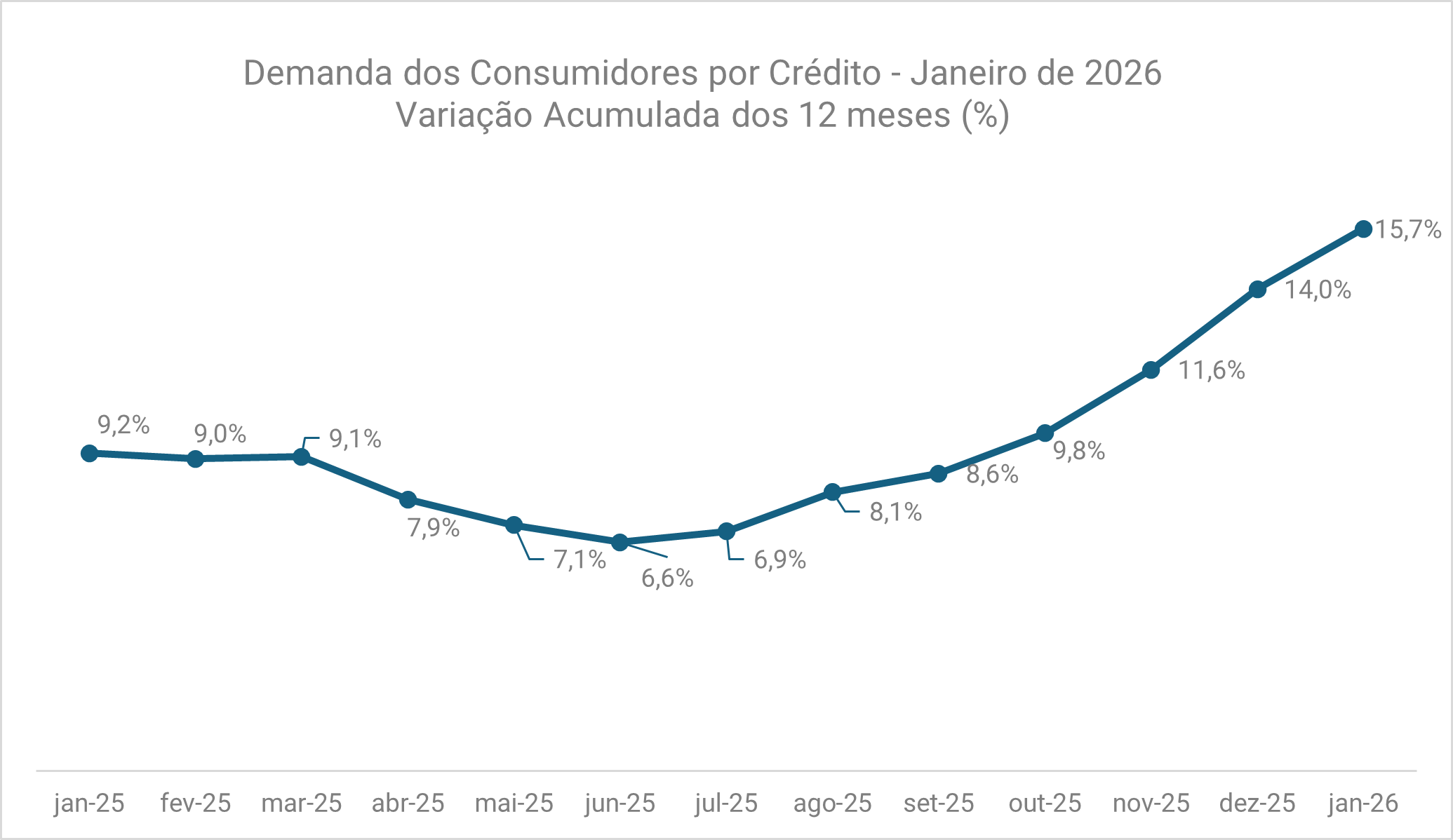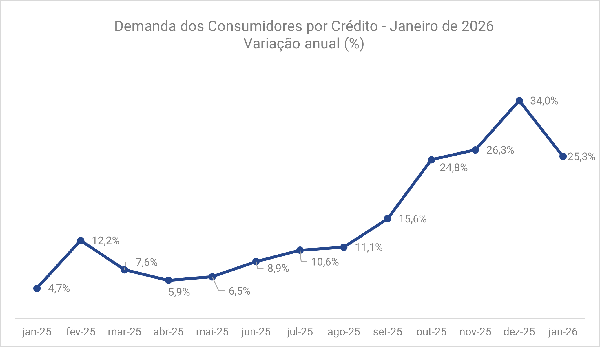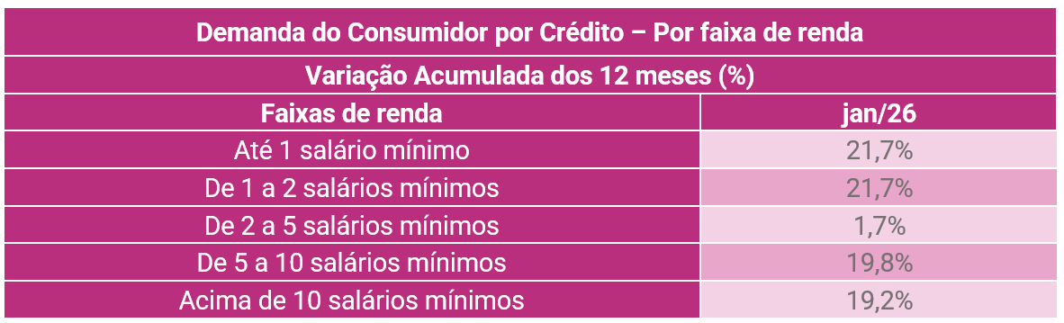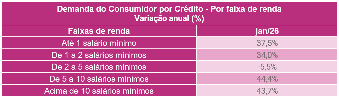 Na comparação anual, a demanda por crédito cresceu 25,3% em janeiro de 2026 em relação ao mesmo mês do ano anterior. Camila explica que o avanço anual observado reforça que a demanda por crédito segue em patamar elevado. “Apesar da perda de fôlego na margem, o crescimento anual da demanda por crédito segue em nível elevado do ponto de vista histórico. O avanço de 25,3% em janeiro se aproxima do ritmo observado durante a pandemia, quando a taxa média de crescimento anual ficou em torno de 22,6% entre março e dezembro de 2021. Ainda que em contextos distintos, o dado evidencia que a procura por crédito continua operando em patamar excepcionalmente alto.” completa. Confira o detalhamento desta visão no gráfico e na tabela a seguir: