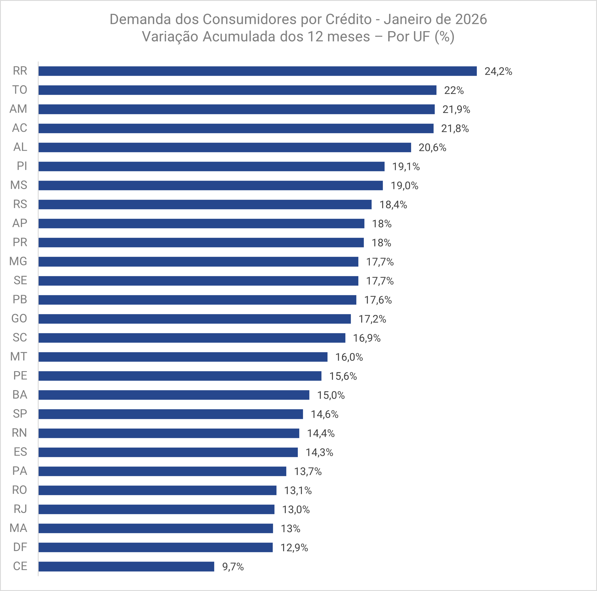 Na análise por Unidades Federativas (UFs), a procura por crédito apresentou crescimento em todo o país ao longo dos últimos 12 meses, ainda que com intensidades distintas entre os estados. Os maiores avanços foram registrados em Roraima (24,2%), Tocantins (22%) e Amazonas (21,9%). Na sequência, também se destacaram Acre (21,8%) e Alagoas (20,6%). Na outra ponta, os menores crescimentos foram observados no Ceará (9,7%), no Distrito Federal (12,9%) e no Maranhão (13%). Confira essa visão no gráfico abaixo: