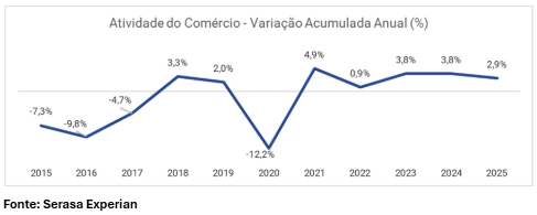 O movimento do varejo físico brasileiro cresceu 2,9% em 2025, conforme aponta a variação acumulada anual do Indicador de Atividade do Comércio da Serasa Experian, primeira e maior datatech do país. Segundo a economista-chefe Camila Abdelmalack, o resultado confirma a expansão da atividade comercial, mesmo em um ano marcado por juros elevados e maior seletividade do crédito, sobretudo no segundo semestre. Confira, no gráfico a seguir, a evolução dos últimos 10 anos: