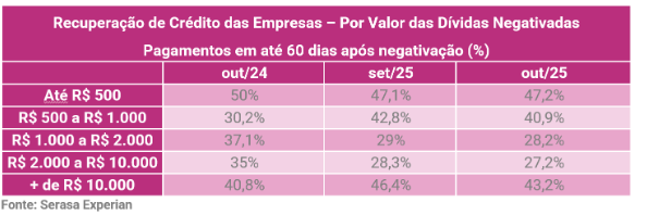 Na visão da Camila, o desempenho da recuperação de crédito por valor da dívida reflete a capacidade de pagamento das empresas e a estratégia de priorização dos compromissos. “As dívidas negativadas de menor valor tendem a apresentar taxas mais elevadas de recuperação no curto prazo, pois são mais fáceis de serem regularizadas e exigem menor esforço financeiro das empresas. Já nos valores mais altos, a recuperação depende mais de renegociação e da estrutura financeira do negócio. Esse comportamento reforça a importância de uma atuação ágil dos credores, sobretudo em um ambiente de juros elevados, em que o custo do crédito influencia diretamente as decisões sobre quando e como regularizar os compromissos”, complementa.