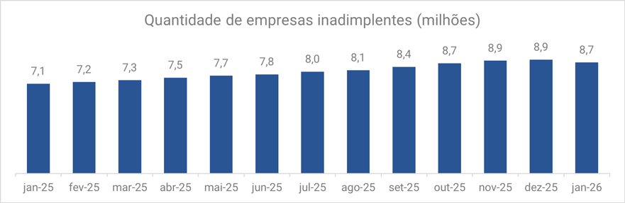 Em janeiro de 2026, o Brasil registrou 8,7 milhões de empresas inadimplentes, segundo o Indicador de Inadimplência das Empresas da Serasa Experian, primeira e maior datatech do Brasil. O número é inferior ao observado em dezembro de 2025, quando 8,9 milhões de companhias estavam negativadas, e interrompe a sequência de aumentos mensais registrada ao longo de 2025 da série histórica. Ao todo, foram contabilizadas 60,1 milhões de dívidas inadimplidas, que somaram R$ 201,7 bilhões. Em média, cada empresa possuía 6,9 contas negativadas no período. Confira, no gráfico abaixo, a série histórica mensal: