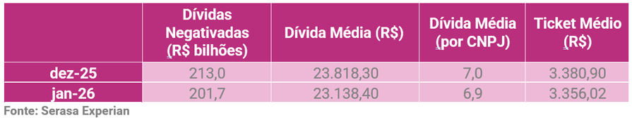 A dívida média por empresa foi de R$ 23.138,40, enquanto o ticket médio das dívidas chegou a R$ 3.356,02. Em relação a dezembro de 2025, observa-se leve redução nos indicadores de endividamento, acompanhando o movimento registrado no número total de empresas inadimplentes. Segundo Camila, a dinâmica de janeiro costuma ter características próprias no ambiente corporativo. “Diferentemente do consumidor, as pressões típicas de início de ano não afetam as empresas com a mesma intensidade. Para o setor empresarial, janeiro tende a ser um mês de pouca variação operacional relevante, já que os maiores desembolsos trabalhistas ocorrem em dezembro. Em alguns segmentos, como comércio e serviços ligados ao varejo, o período ainda conta com liquidações e ajustes de estoque que ajudam a sustentar o caixa”, afirma.
