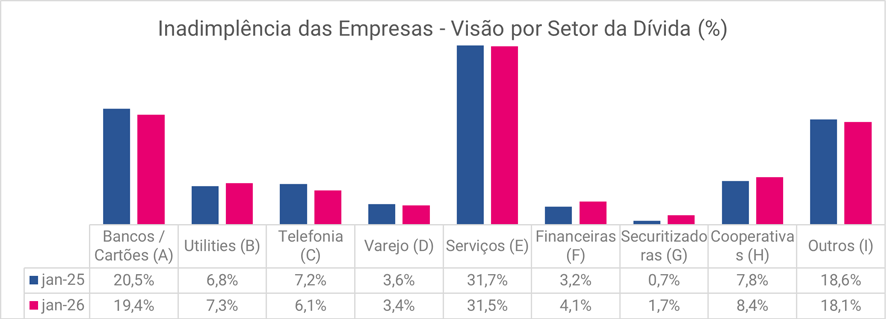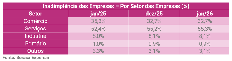 Entre os setores das empresas negativadas, “Serviços” liderou com 55,3% do total em janeiro de 2026. Na sequência apareceram “Comércio” (32,7%) e “Indústria” (8,1%). Já na análise por setor de origem das dívidas, o maior volume de negativações também esteve em “Serviços” (31,5%), seguido por “Bancos e Cartões” (19,4%). Confira o detalhamento na tabela e no gráfico abaixo: