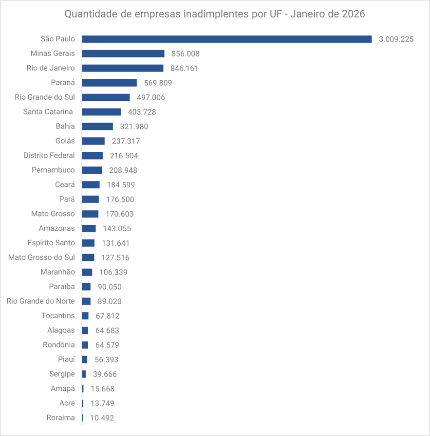 Regionalmente, o Sudeste concentrou 4,84 milhões de empresas inadimplentes em janeiro de 2026. Na sequência apareceram Sul (1,47 milhão), Nordeste (1,16 milhão), Centro-Oeste (751 mil) e Norte (491 mil). Na comparação com dezembro de 2025, a redução do total nacional não foi homogênea entre as Unidades Federativas. Enquanto estados como Bahia, Goiás, Pernambuco e Maranhão registraram queda no número de empresas negativadas, outros, como São Paulo, Minas Gerais, Rio de Janeiro, Paraná, Santa Catarina e Rio Grande do Sul, apresentaram aumento no período. “A variação mensal entre os estados reflete dinâmicas regionais distintas”, explica Camila. “A oscilação de um mês para o outro não ocorre de forma uniforme entre as unidades da Federação e também está relacionada ao peso da base empresarial local, já que unidades com maior base empresarial naturalmente concentram volumes mais elevados de negativações”, complementa.