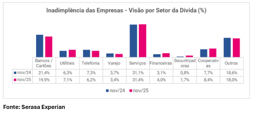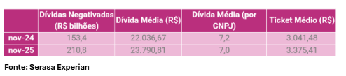 Ainda segundo os dados de novembro de 2025, as empresas inadimplentes possuíam, em média, 7 contas negativadas, cujo ticket médio foi de R$ 3.375,4, enquanto a dívida média por empresa alcançou R$ 23.790,8. Veja, na tabela abaixo, a comparação desses indicadores com o mesmo período do ano passado: