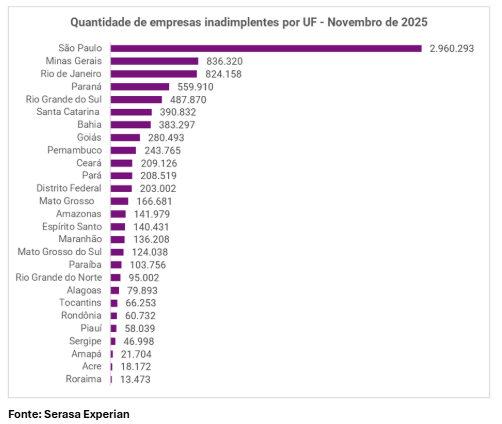 Regionalmente, o Sudeste concentrou 4,76 milhões de empresas inadimplentes, o equivalente a 53,7% do total nacional. Na sequência apareceram Sul (1,44 milhão), Nordeste (1,36 milhão), Centro-Oeste (774 mil) e Norte (531 mil). Entre as Unidades Federativas, São Paulo, Minas Gerais, Rio de Janeiro, Paraná e Rio Grande do Sul lideraram com os cinco maiores números de CNPJs negativados no período. Confira no gráfico abaixo o detalhamento das Unidades Federativas (UFs):