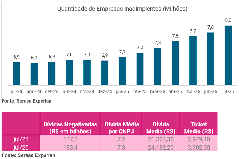 Pelo sétimo mês consecutivo, a inadimplência das empresas bateu o recorde da série histórica e chegou, em julho, aos 8 milhões de CNPJs nesta situação, um aumento de mais de 200 mil negócios desde junho e de 1,1 milhão na comparação com julho de 2024, segundo os dados do Indicador de Inadimplência das Empresas, elaborado pela Serasa Experian, primeira e maior datatech no país. O tícket médio das dívidas também atingiu a máxima histórica da série, R$ 3.302,30 – com média de 7,3 dívidas por empreendimento. Juntas, todas as dívidas somam R$ 193,4 bilhões. Confira o histórico dos últimos 12 meses no gráfico abaixo:
