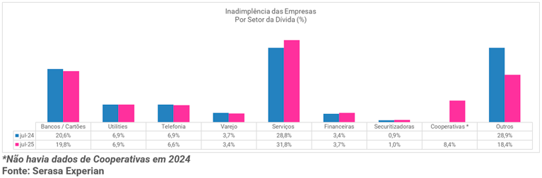 De acordo com o indicador, o setor de “Serviços” concentrou a maior fatia dos CNPJs negativados em julho, respondendo por 54,1% do total. Na sequência, apareceram os segmentos de “Comércio” (33,7%) e “Indústria” (8,0%). As categorias agrupadas como “Outros”, que incluem empresas do ramo Financeiro e do Terceiro Setor, representaram 3,2%, enquanto o setor Primário completou a lista com 1,0%.