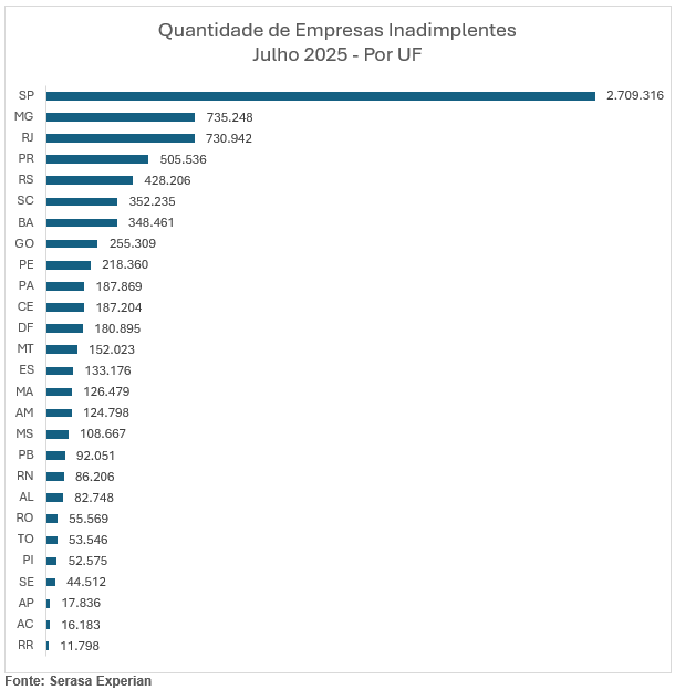 O Indicador Serasa Experian de Inadimplência das Empresas contempla a quantidade de empresas brasileiras que estão em situação de inadimplência, ou seja, possuem pelo menos um compromisso vencido e não pago, apurado no último dia do mês de referência. O Indicador é segmentado por UF, porte e setor.