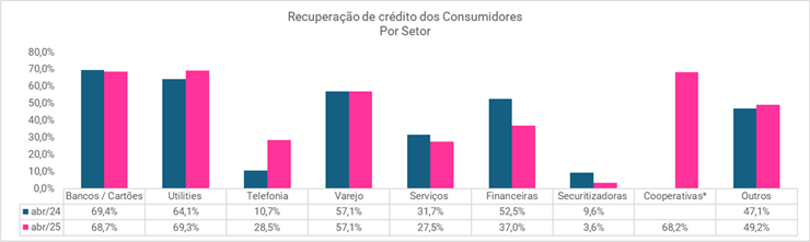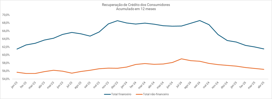 A regularização de dívidas inadimplidas por consumidores nos últimos 12 meses (maio de 2024 a abril de 2025) no setor financeiro (Bancos, Cartões e Financeiras) foi de 61,5%, o menor patamar desde janeiro de 2023. Os dados são do Indicador de Recuperação de Crédito da Serasa Experian, primeira e maior datatech do Brasil. Os dados consideram que a regularização pode ter sido feita por meio de quitação ou renegociação em até 60 dias da data de negativação. As dívidas fora do setor financeiro (luz, água, telefonia, varejo, entre outras) mostraram uma recuperação inferior, de 56,4%. Veja, no gráfico a seguir, o comparativo entre os setores financeiro e não-financeiro: