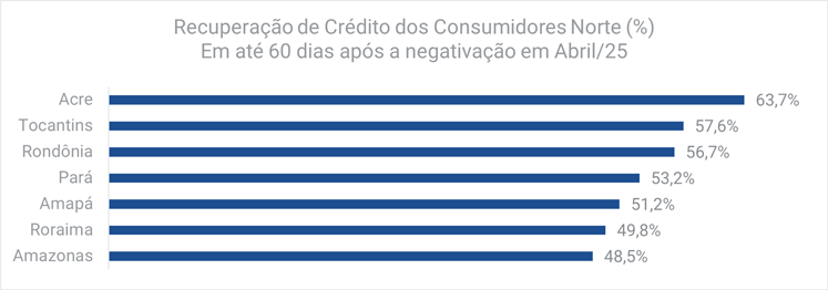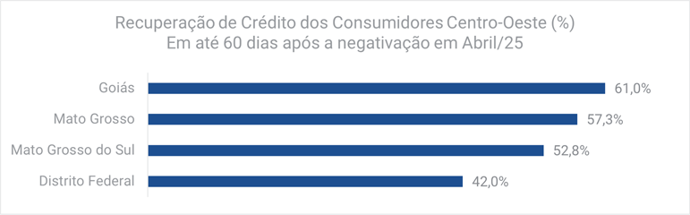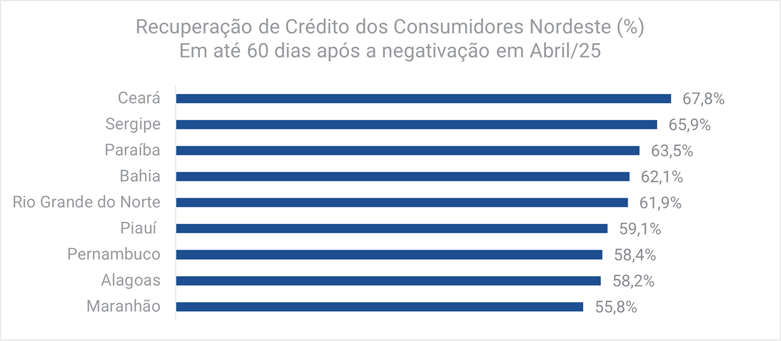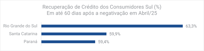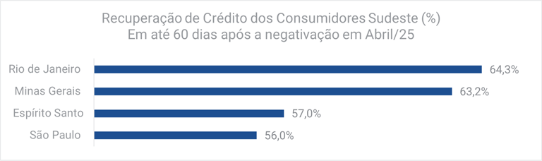 A visão pelas regiões do Brasil mostra que a quitação no período das dívidas dos consumidores no Nordeste foi de 62,1% em até 60 dias após a negativação, com destaque para o Ceará (67,8%) e Sergipe (65,9%), que impulsionaram este resultado. O Sul apareceu na sequência (61%), seguido por Sudeste (59,5%), Centro-Oeste (54,7%) e Norte (53,2%). Confira os dados completos no gráfico a seguir: