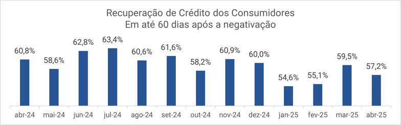 As dívidas mais caras (acima de R$ 10 mil) foram as mais sanadas em até 60 dias após a negativação em abril, com 68,6% de recuperação. Para conferir mais informações e a série histórica do indicador, acesse a página oficial clicando aqui.