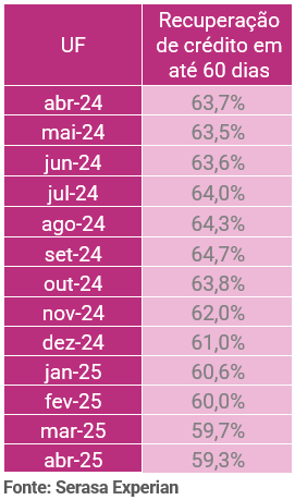 O Indicador de Recuperação de Crédito da Serasa Experian considera o número de dívidas incluídas no sistema de inadimplência em cada mês específico. A medida de até 60 dias para quitação dos compromissos financeiros deste indicador foi selecionada por refletir a régua comum utilizada pelas soluções de cobrança, mas esse tempo pode variar de acordo com cada credor.