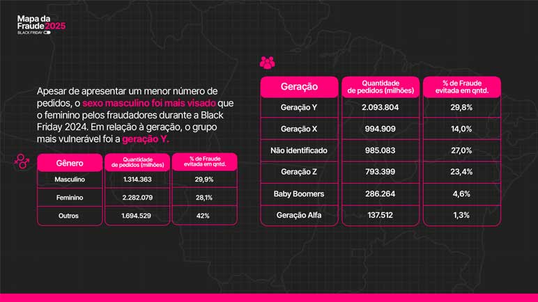 • A Geração Y liderou as compras, com mais de 2 milhões de transações, e foi vítima da maior fatia de tentativas de fraudes (29,8%).