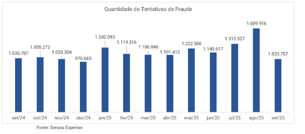 O Brasil registrou 10.886.982 tentativas de fraude no acumulado de janeiro a setembro de 2025, um aumento de 28,6% em relação ao mesmo período de 2024, com uma ocorrência a cada 2,2 segundos. Os dados são do Indicador de Tentativas de Fraude da Serasa Experian, primeira e maior datatech do Brasil, e evidenciam a rápida evolução das táticas criminosas no ambiente digital na comparação anual. A companhia projeta que, mantido o ritmo observado, o país deve ultrapassar 14 milhões de tentativas de fraude até o fim do ano. Abaixo, confira o gráfico do detalhamento mês a mês das tentativas de fraude: