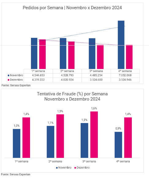 Ainda segundo o levantamento, embora o volume de ataques tenha ficado ligeiramente abaixo do observado em novembro de 2024 a taxa das fraudes no total de pedidos cresceu de 1% para 1,4% na comparação dos dois períodos, indicando que, mesmo com menos compras após a Black Friday, a pressão dos golpistas sobre o canal digital permanece elevada. A seguir, confira os gráficos de pedidos e tentativas de fraude, com a evolução semanal e o comparativo entre novembro e dezembro: