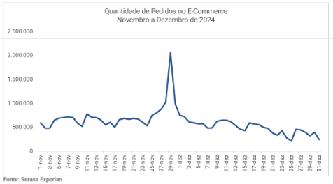 Na sequência, o estudo mostra, ainda, que houve um pico de pedidos durante a Black Friday de 2024, quando o volume transacionado foi 99,33% maior do que a média de novembro sem o dia do evento. Ao longo do mês, o número diário de pedidos oscilou até a data promocional e, após o pico, passou a recuar, movimento que se estendeu ao mês de dezembro. Abaixo o gráfico mostra a evolução de pedidos entre 1 de novembro e 31 de dezembro de 2024: