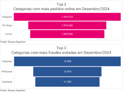 • Calçados lideram compras e golpes: 1,47 milhão de pedidos e 19,3 mil tentativas de fraude na categoria