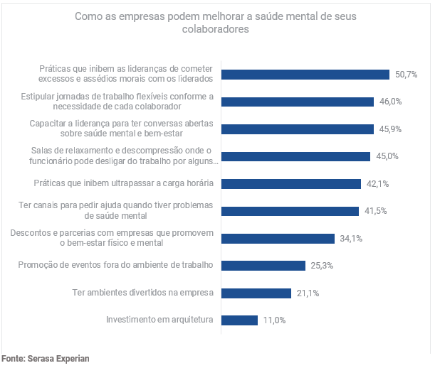 Entre as medidas que podem contribuir para ambientes mais saudáveis estão práticas que coíbam excessos e assédios morais por parte das lideranças (51%), seguidas por jornadas de trabalho flexíveis, adaptadas à realidade de cada colaborador (46%), entre outras. Confira o ranking de tópicos apontados pelos profissionais ouvidos no gráfico abaixo: