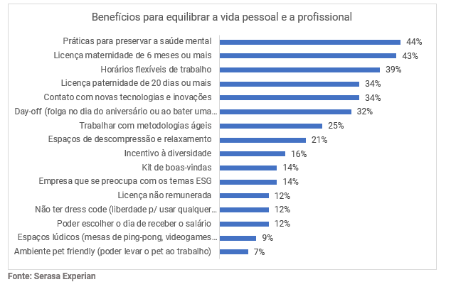 Quando perguntados sobre as iniciativas que mais valorizam para equilibrar a vida pessoal com a profissional, 44% dos profissionais consideraram “práticas voltadas à preservação da saúde mental” como a principal. Em seguida, destacou-se “horários flexíveis de trabalho” (39%) e as licenças parentais estendidas, como maternidade de seis meses (43%) e paternidade de 20 dias (34%). Veja no gráfico a seguir o detalhamento completo: