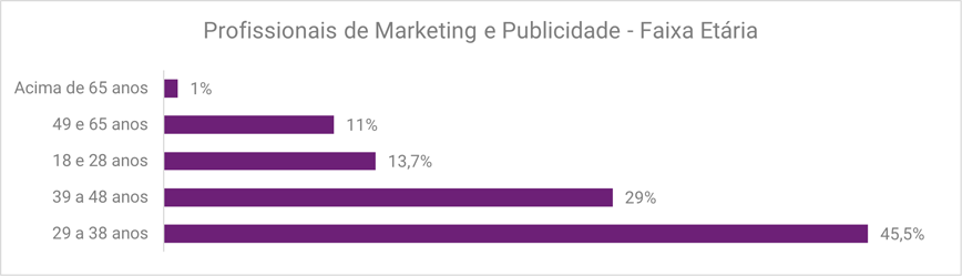Entre os profissionais de marketing e publicidade mapeados, quase metade (45,5%) tem entre 29 e 38 anos. Na sequência, 29% estão na faixa de 39 a 48 anos e 13,7% entre 18 e 28 anos. Confira o detalhamento por faixa etária no gráfico abaixo: