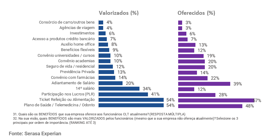 Uma nova pesquisa da Serasa Experian, primeira e maior datatech do país, revela que, na avaliação dos empregadores brasileiros, a satisfação de 93% dos profissionais é diretamente impactada pelo pacote de benefícios oferecido pela empresa. Plano de saúde/telemedicina/odontológico (54%) e vale-refeição/alimentação (54%) lideram as preferências dos profissionais e figuram entre os benefícios mais praticados pelas organizações (48% e 57%, respectivamente).