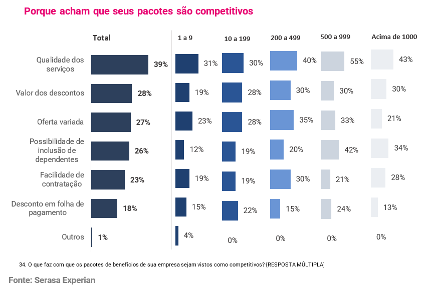 Ainda segundo a pesquisa, na visão dos empregadores, quando os benefícios se destacam, o diferencial está menos na quantidade e mais na qualidade. Para 39% dos profissionais, segundo a percepção dos empregadores, a qualidade dos serviços é o fator mais importante, seguida pelo valor dos descontos (28%) e pela variedade de benefícios (27%). A possibilidade de incluir dependentes também se destaca (26% no total), sobretudo nas empresas maiores, onde esse fator chega a ser citado por mais de quatro em cada dez respondentes. Em contrapartida, aspectos como desconto em folha (18%) e facilidade de contratação (23%) têm impacto menor segundo as organizações, indicando que o trabalhador valoriza mais a experiência e a proteção oferecidas do que a simples conveniência administrativa.