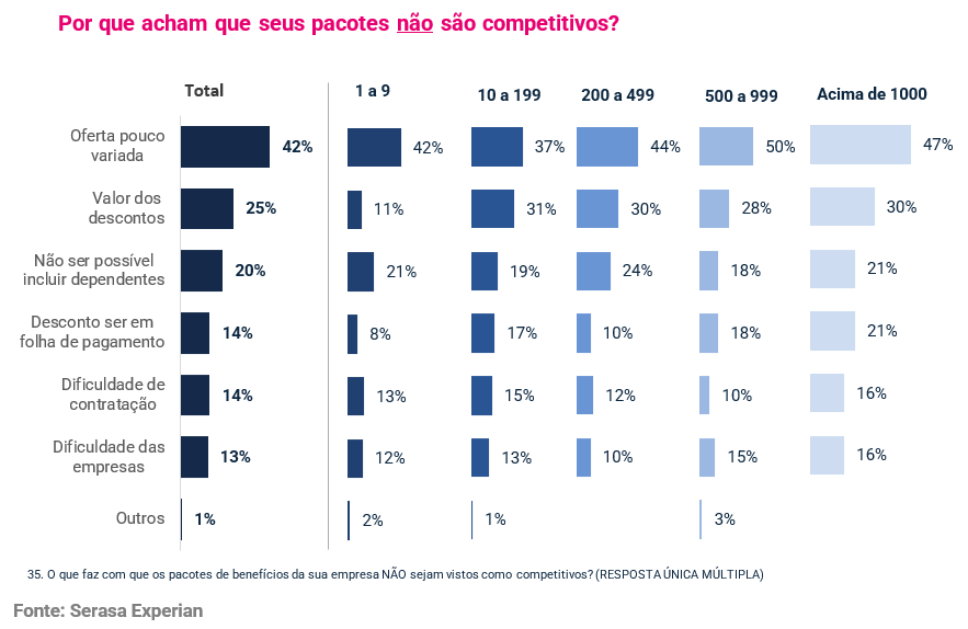 Essa percepção apontada pelos empregadores está diretamente relacionada ao nível de diversidade e qualidade dos benefícios. A baixa variedade aparece como o principal fator de desvalorização: 42% dos respondentes apontam a oferta pouco variada como o motivo central para considerar o pacote não competitivo. Em contrapartida, iniciativas que ampliam a gama de benefícios, melhoram a qualidade dos serviços e incluem dependentes tendem a elevar significativamente a percepção de valor.