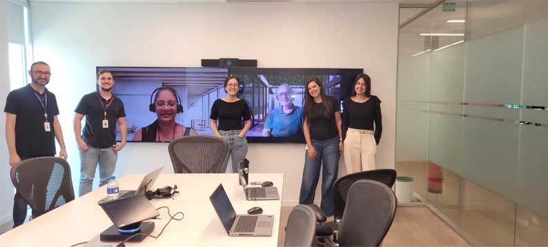 Da esquerda para a direita: Marcos Menegazzi, Guilherme Sibinel, Thays Oliveira, Tais Larocca e Maria Eduarda Schmidt. Na tela, Fabiana Silva e José Garcia Coelho