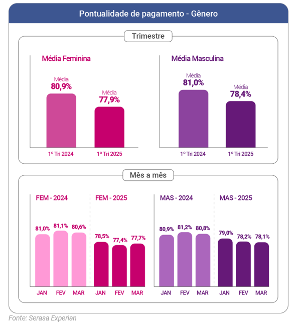 Em termos de gênero, a pontualidade média também caiu para homens e mulheres entre primeiro trimestre de 2024 e o de 2025. Enquanto para o público masculino o índice caiu de 81% para 78,4%, para o público feminino a queda foi maior: de 80,9% para 77,9% - 2,6 pontos percentuais versus 3 p.p. O detalhamento mês a mês durante ambos os trimestres pode ser visto no gráfico abaixo.