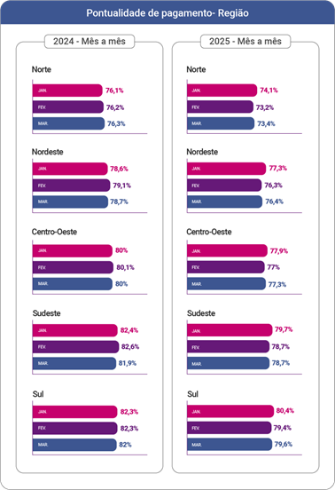 Em relação às regiões do país, também observamos quedas nos comparativos entre trimestres. O Sudeste teve a maior diminuição de pontualidade entre os períodos com uma queda de 3.3 pontos percentuais, saindo de 82,3% nos primeiros três meses de 2024 para 79% no mesmo período de 2025. No gráfico abaixo, é possível ver o detalhamento por cada região.