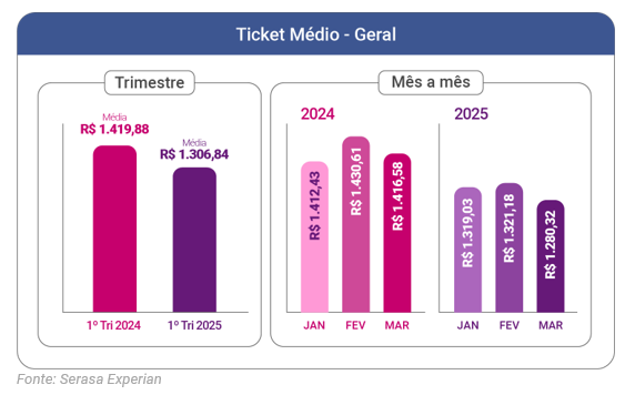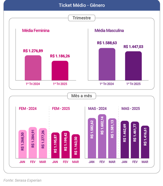 Entre os gêneros também observamos o mesmo movimento. No comparativo, o ticket feminino teve uma queda de R$90,63 – saindo de R$1.276,89 para R$1.186,26. Já no caso masculino, vemos uma redução maior, de R$141,06. O ticket médio nos primeiros três meses de 2024 estavam na faixa de R$ 1.588,63 enquanto no mesmo período de 2025, R$1.447,03. No gráfico abaixo, o valor do ticket médio a cada mês no trimestre em 2024 e 2025.