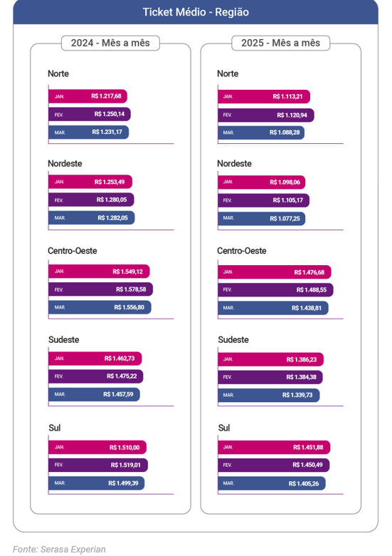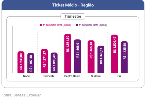 Regionalmente, a maior queda do ticket médio foi observada no Norte. Em 2024, o valor estava, em média, em R$ 1.233,00 e, atualmente, em R$ 1.107,48 – uma redução de R$ 125,52. Já a menor queda nesses valores foi observada na região Sul. O ticket médio no primeiro trimestre do último ano estava em R$ 1.509,47 e, no primeiro trimestre deste ano, em R$ 1.435,88, uma diminuição de R$ 73,59. Os números das demais regiões estão no gráfico abaixo.