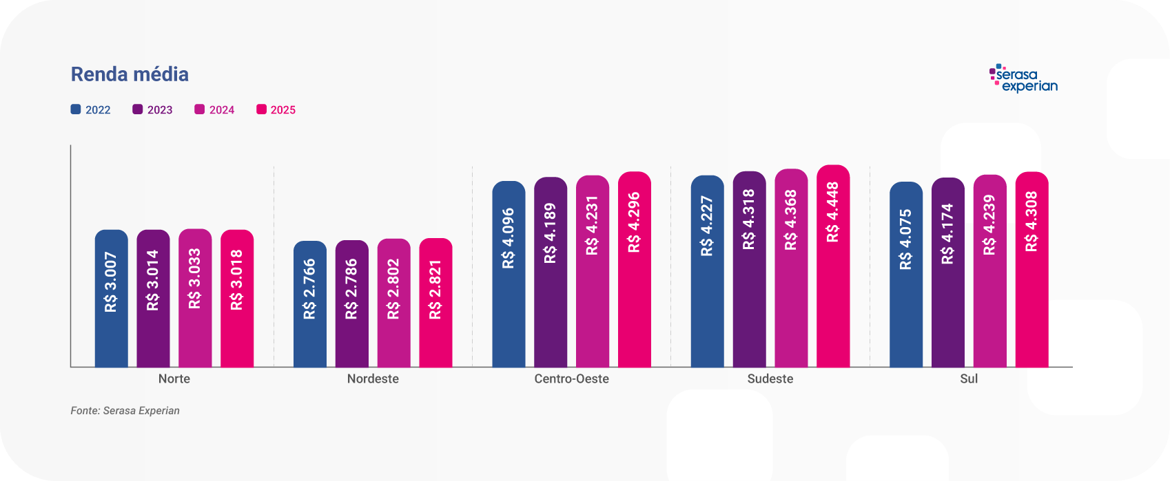 No mesmo intervalo, a renda média do consumidor cresceu em todas as regiões, mas de forma desigual. O Sul avançou de R$ 4.075 para R$ 4.308 e o Sudeste de R$ 4.227 para R$ 4.448. Já no Norte, a renda média passou de R$ 3.007 para R$ 3.018, enquanto o Nordeste saiu de R$ 2.766 para R$ 2.821, permanecendo com os menores rendimentos do país.