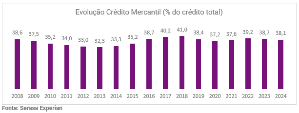 Frente ao cenário de juros elevados, com a Selic em 15% desde junho, e uma concessão de crédito bancário mais criteriosa, conforme observamos a desaceleração ao longo do último ano, o crédito mercantil tende a ganhar ainda mais relevância.