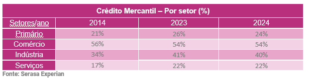 Os dados da datatech mostram que essa modalidade tem forte concentração no setor de Comércio, que respondeu por 54% do total em 2024, patamar estável em relação a 2023, e levemente abaixo de 2014. A Indústria aparece em seguida, com 40% em 2024, após alcançar 41% no ano anterior, indicando relativa estabilidade. Já o setor Primário teve retração no período mais recente, passando de 26% para 24% ano contra ano, enquanto o segmento de Serviços ficou estável em 22%. Confira os dados na íntegra na tabela a seguir: