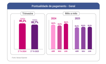 Um levantamento inédito da Serasa Experian, primeira e maior datatech do Brasil, mostra que a pontualidade média de pagamento do empréstimo pessoal dos brasileiros apresentou queda no segundo trimestre de 2025, quando comparada ao mesmo período de 2024. A média trimestral recuou de 85,2% no 2º trimestre de 2024 para 82,7% no 2º trimestre de 2025, o que representa uma diminuição de 2,5 pontos percentuais. O estudo tem como base informações do Cadastro Positivo.