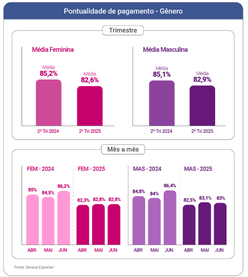 No recorte por gênero, a pontualidade média do empréstimo pessoal também caiu entre os períodos analisados. Entre as mulheres, o indicador médio passou de 85,2% no segundo trimestre de 2024 para 82,6% no mesmo trimestre de 2025. Já entre os homens, a pontualidade recuou de 85,1% para 82,9% no comparativo anual. A abertura mensal mostra que, em ambos os públicos, os três meses do segundo trimestre de 2025 ficaram abaixo dos níveis registrados em 2024, conforme gráfico abaixo.