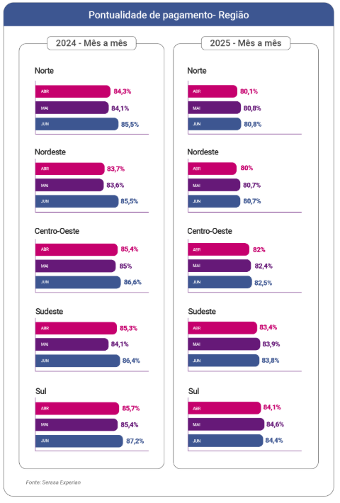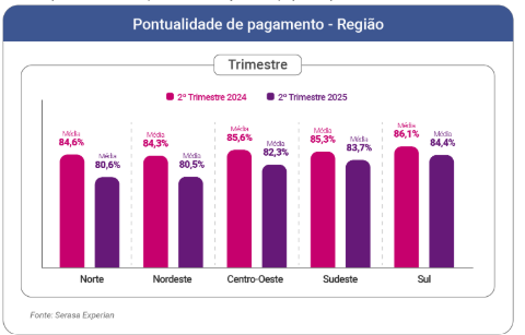 “A pontualidade de pagamento do empréstimo pessoal é um dos sinais captados do Cadastro Positivo para entender o momento financeiro das famílias. A queda de 2,5 pontos percentuais no segundo trimestre de 2025, em relação ao mesmo período do ano anterior, indica um cenário de maior comprometimento da renda, resultado do avanço do endividamento aliado à alta de juros vigente no cenário econômico. Esse contexto reduz a capacidade de absorver novas parcelas e aumenta a dificuldade de se manter os pagamentos em dia”, explica Camila Abdelmalack, economista da Serasa Experian.