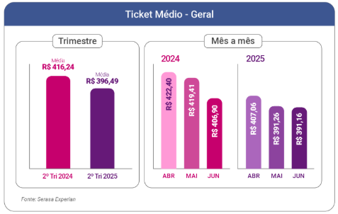 O levantamento do Cadastro Positivo mostra ainda que o ticket médio do empréstimo pessoal também apresentou retração no comparativo anual. A média do segundo trimestre de 2024 foi de R$ 416,24, enquanto no mesmo período de 2025 o valor caiu para R$ 396,49, uma redução de R$ 19,75. Na análise mês a mês, os valores médios de abril, maio e junho de 2025 ficaram consistentemente abaixo dos observados nos mesmos meses do ano anterior.